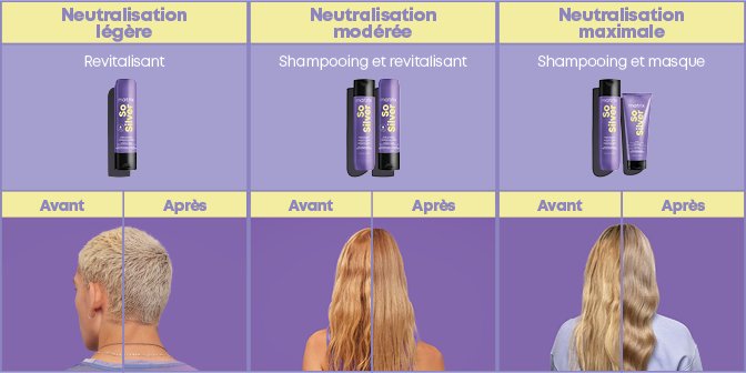 Le niveau de pigmentation augmente graduellement à partir du revitalisant pigmenté So Silver, suivi du shampooing, jusqu'au masque capillaire, qui est le plus pigmenté.